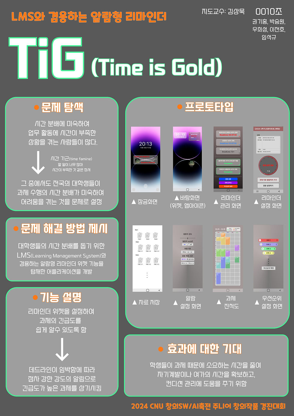 일상속 불편한 점을 개선하고자 주제를 선정, 그중 사람들이 시간분배에 서툴러 업무효율이 떨어져 주어진 시간이 짧게 느껴진다고 결론을 내림. 그중 대학생에 초점을 맞추어 과제 수행을 돕고자 함